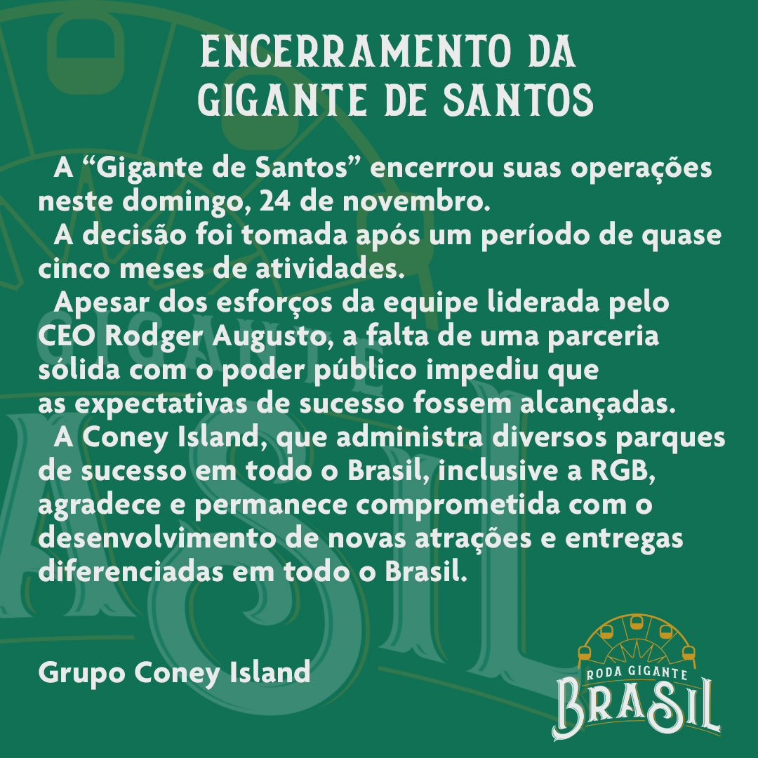 Sendo assim, a Roda Gigante Brasil do grupo Coney Island responsável pela “Gigante de Santos” como é chamada a roda gigante, publicou um comunicado nas redes sociais informando que houve o encerramento das operações no último domingo (24).