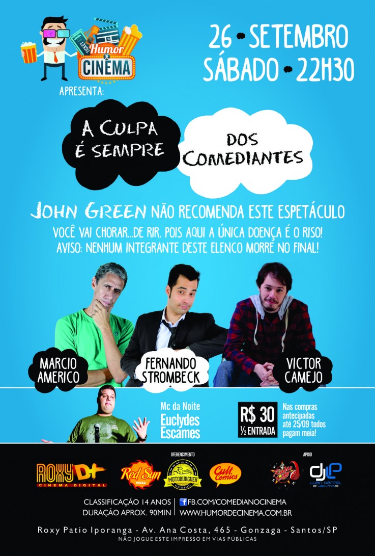 HC_ACulpaedosComediantes-e1442417276627Contando com o mestre de cerimônias Euclydes Escames, se apresentarão Marcio Américo, Fernando Strombeck e Victor Camejo.
