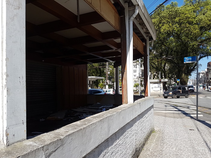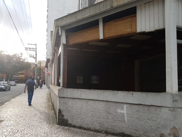 A poucos metros dali, a antiga agência da Caixa também está coberta com tapumes.