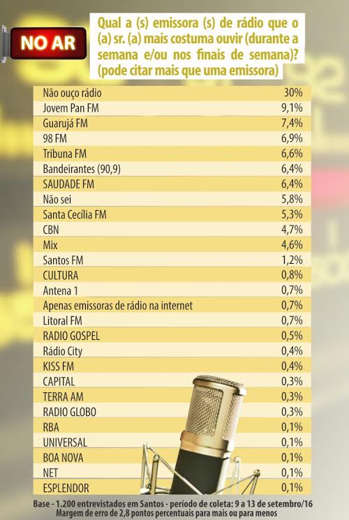 Com 9,1% das citações, a rádio Jovem Pan FM é a mais ouvida pelos santistas, segundo pesquisa Enfoque/Jornal Boqnews, que ouviu 1200 santistas entre os dias 9 e 13 de setembro. Em segundo lugar, aparece a rádio Guarujá FM, com 7,4%, seguida pela 98 FM, com 6,9%. Outros 30% não ouvem rádio. O levantamento completo está disponível em boqnews.com/pesquisas