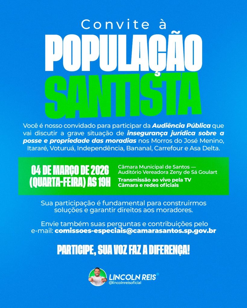A Câmara Municipal de Santos promove, no dia 4 de março de 2026, às 19 horas, uma Audiência Pública para discutir a insegurança jurídica que afeta moradores dos morros da cidade. O encontro surge após solicitação formal apresentada por meio do Requerimento nº 49/2025, de autoria do vereador Lincoln Soares dos Reis.