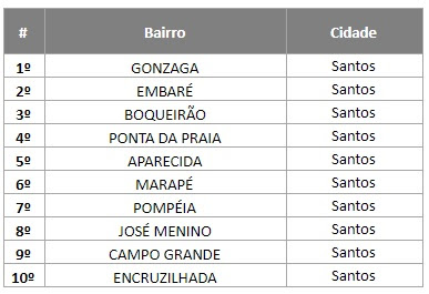 A lista de bairros mais procurados na cidade segue com Embaré (2°), Boqueirão (3°), Ponta da Praia (4°) e Aparecida (5°).