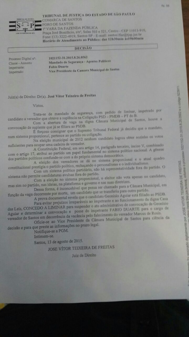 O suplente de vereador do PSD, Fábio Duarte, obteve há pouco uma liminar concedida pelo juiz José Vitor
