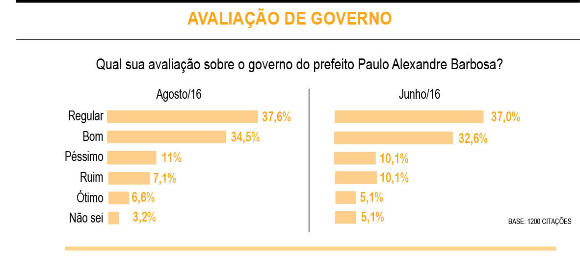 A avaliação de uma administração se reflete nas chances ou não de reeleição. Neste sentido, o prefeito tem 53,3% de aprovação, percentual ligeiramente superior ao último levantamento de junho, com 50,7%, mas dentro da margem de erro de 2,8 pontos percentuais para mais ou menos.