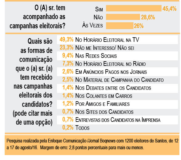 m duas semanas, os 338.474 mil eleitores de Santos, e de todos os demais municípios brasileiros, irão às urnas para votar nos seus representantes para prefeito e vereador. Na Cidade, oito candidatos concorrem pela prefeitura e 385 por uma das 21 cadeiras da Câmara Municipal.