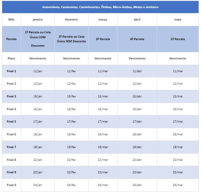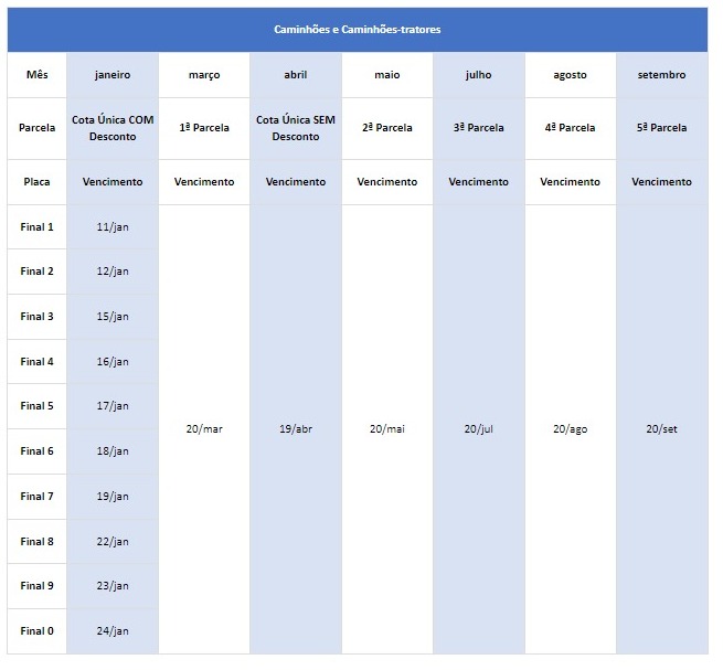 Os caminhões têm prazos diferenciados: para o pagamento integral em janeiro é concedido desconto de 3%; para os proprietários que optarem pelo parcelamento em três, quatro ou cinco vezes, sem desconto, os vencimentos são em 20 de março, 20 de maio, 20 de julho, 20 de agosto e 20 de setembro (veja as tabelas completas abaixo).