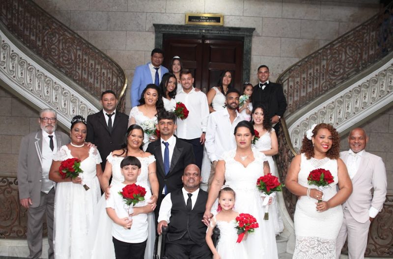 Nove casais oficializaram a união na 14ª edição do Casamento Comunitário em Santos, realizada nesta quarta-feira (19) à noite. A cerimônia, promovida pela Coordenadoria de Políticas para a Mulher, ligada à Secretaria da Mulher, Cidadania, Diversidade e Direitos Humanos (Semulher), atende casais que não conseguem arcar com os custos de casamento e celebração.