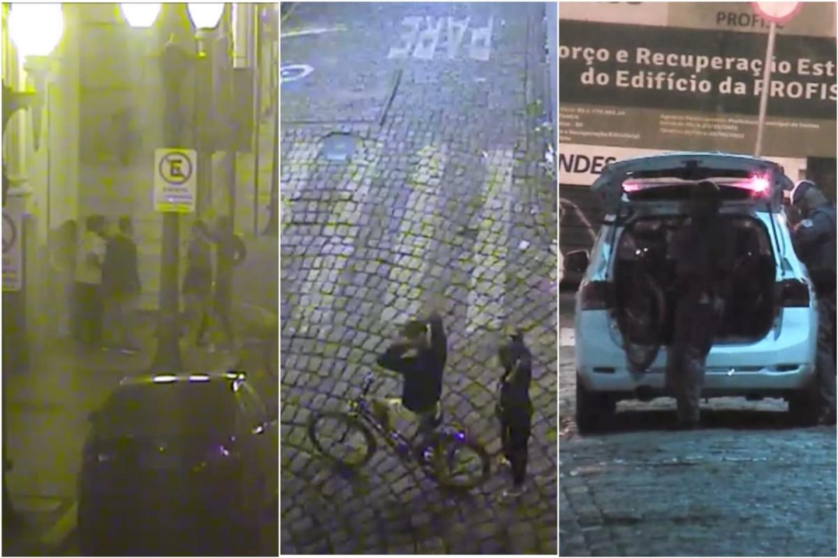 Além disso, nas imagens é possível visualizar quando a dupla se aproxima de um grupo de pessoas caminhando na Rua XV de Novembro e o aborda.