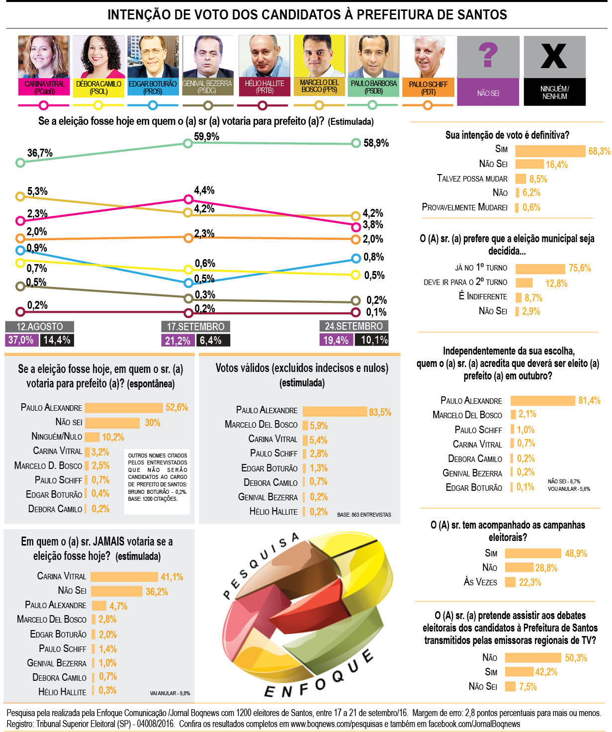 Os números conspiram a favor para a reeleição do prefeito Paulo Alexandre Barbosa (PSDB). Além de deter o maior tempo do horário eleitoral (cerca de 60% do total – equivalente a 52 minutos dentro de 1h30 da programação diária para si e para candidatos da sua base de apoio), todos os demais indicadores lhe são amplamente favoráveis, conforme nova pesquisa Enfoque Comunicação/Jornal Boqnews.