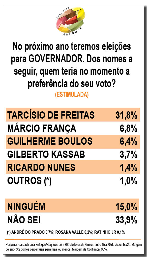 Pesquisa realizada pela Enfoque/Boqnews com 812 eleitores de Santos, divididos por faixas etárias e zonas eleitorais de forma proporcional.