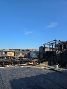 Ao amanhecer, é possível constatar o impacto das labaredas no Caminho São José. Trinta profissionais do Corpo de Bombeiros combateram as chamas, que atingiram uma área de 300 m2 formada por casas de madeira, de fácil combustão.