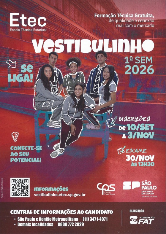 As Escolas Técnicas Estaduais (Etecs) estão com inscrições abertas para o processo seletivo do primeiro semestre de 2026, até as 15h do dia 3 de novembro pelo site vestibulinho.etec.sp.gov.br.
