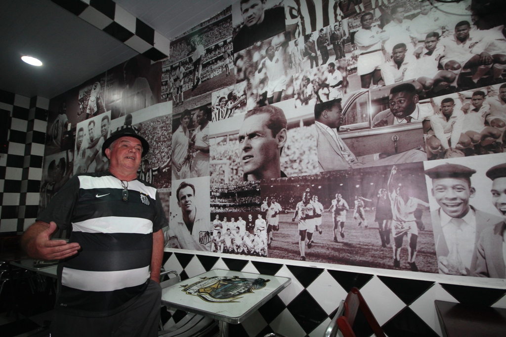 Carlinhos e seu painel em homenagem aos ídolos históricos do Santos FC: ex-jogadores frequentam o local costumeiramente. Foto: Nara Assunção