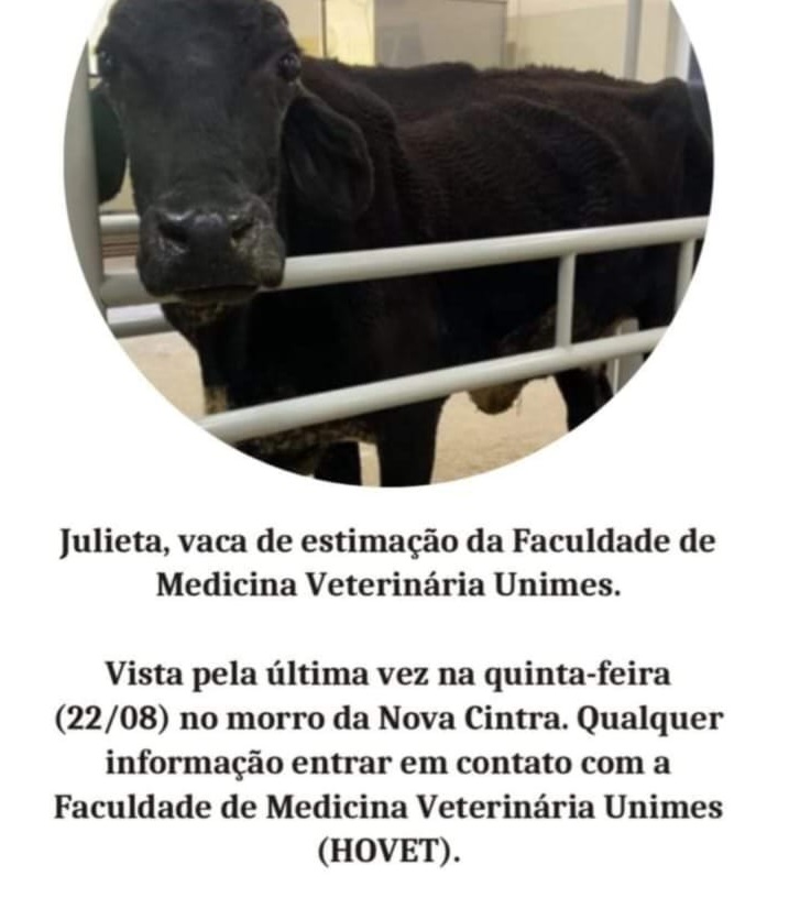 No entanto, o desaparecimento da vaca Julieta, de 22 anos, que nasceu e que foi criada no Hospital Veterinário da Universidade Metropolitana de Santos (Unimes), causou comoção dos alunos, que exigem respostas para o ocorrido.