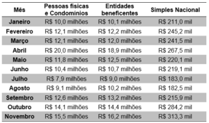 A liberação dos créditos deste mês de novembro é referente às compras e doações de documentos fiscais realizadas em julho de 2021.Deste montante, R$ 16,2 milhões foram destinados a instituições filantrópicas para utilização em seus projetos.