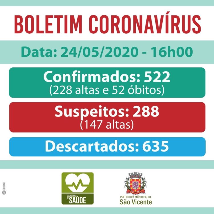 Boletim divulgado às 16 mostra que a Cidade contabiliza em 522 casos positivos de Covid-19, com 52 óbitos, 228 altas (pessoas curadas), 194 recomendações de isolamento domiciliar e 48 internações (quatro em UTI).