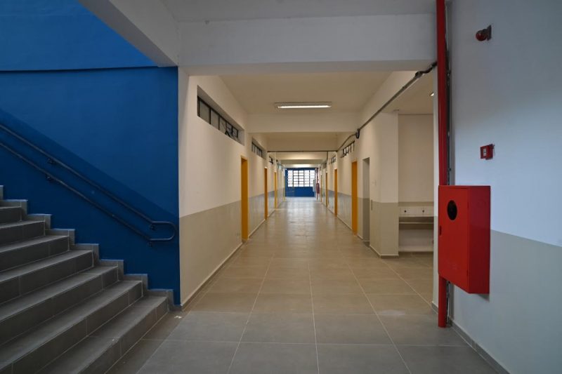 Em paralelo ocorre a instalação de sanitários com acessibilidade e a pintura das paredes das escadas e das salas de toda a escola.