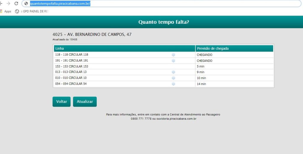 Além disso, por meio do site quanto tempo falta é possível o passageiro consultar tempo previsto para a chega do coletivo no ponto escolhido e se o veículo é climatizado (representado pelo símbolo de refrigeração).