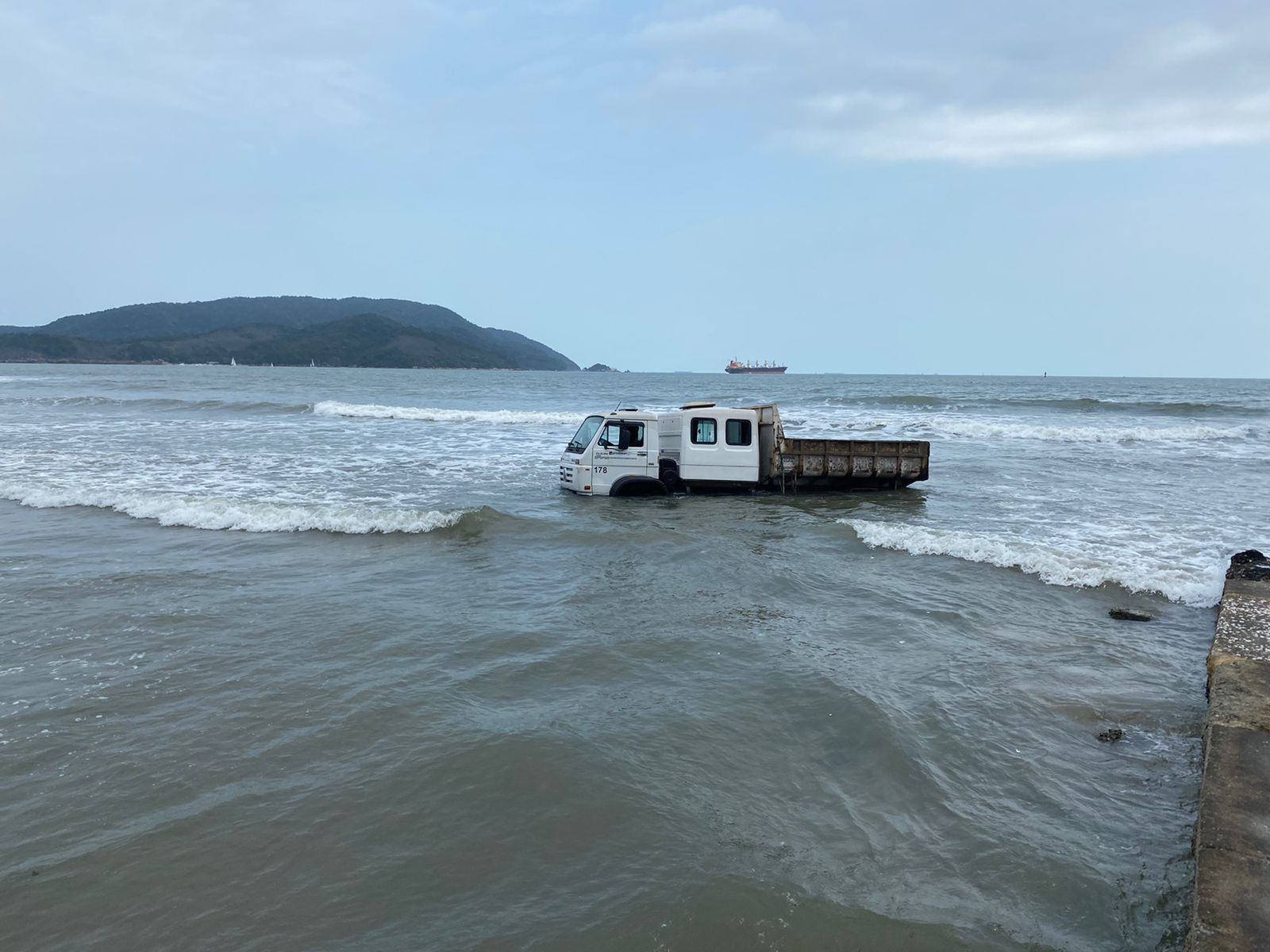Caminhão de limpeza da Prodesan “encalha” na praia do Embaré