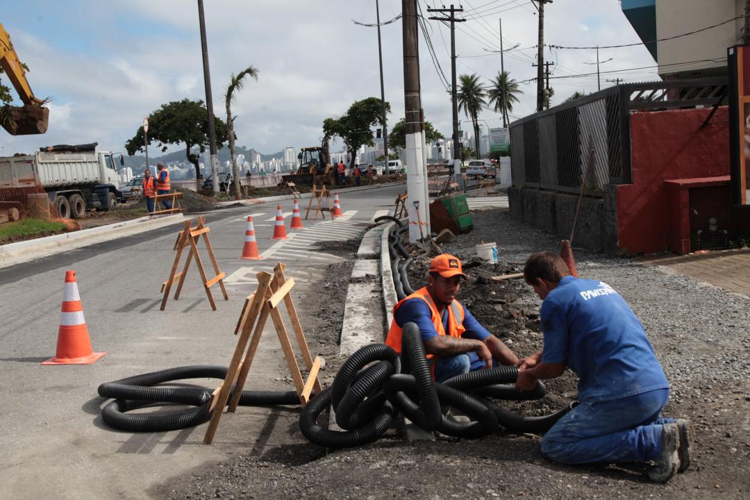 Nesta etapa das obras da Nova Ponta da Praia, 12 postes de iluminação pública estão sendo remanejados para o novo canteiro central.