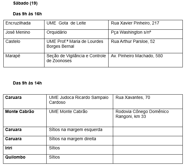 A imunização na sede da Seção de Vigilância e Controle de Zoonoses (Sevicoz – Av. Pinheiro Machado, 580), no Marapé, segue fixa de segunda a sexta-feira e também no sábado, das 9 às 16h.