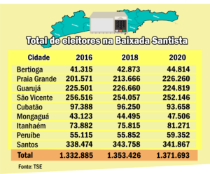 Na Baixada Santista, são 1.371.693, alta de 1,3% em relação às eleições de 2018.