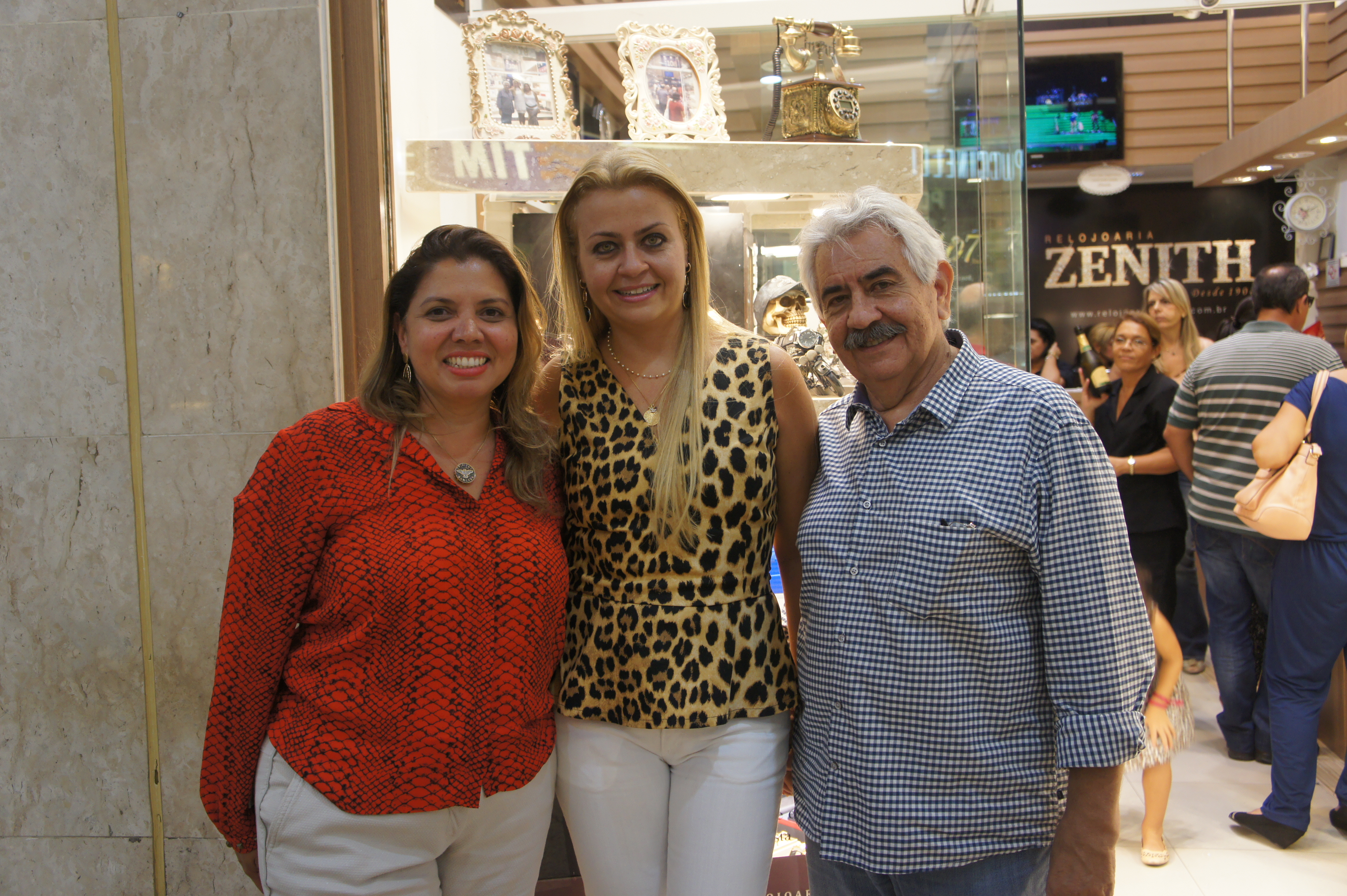 A empresária diretora da Relojoaria Zenith, Fabiana do Carmo Figueiredo e seu pai, Claudino Figueiredo Neto (o seo Neno), ao lado da superintendente do Praiamar Shopping, Mariane Doconski (à esquerda), durante coquetel de comemoração do aniversário dos 107 anos da tradicional joalheria santista, realizado na última quinta (19), no Praiamar Shopping. Evento teve lançamento da linha Eternity Zenith, composta por pulseiras femininas personalizadas. Sucesso!