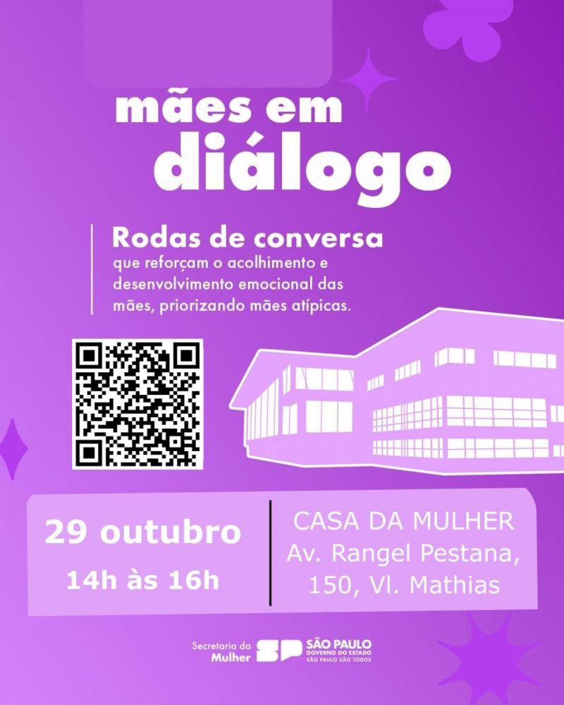 A Casa da Mulher de Santos (Av. Rangel Pestana, 150, Vila Mathias) será o ponto de encontro para o evento gratuito Mães em Diálogo, quarta-feira (29), das 14h às 16h. Iniciativa da Secretaria da Mulher do Governo do Estado, a roda de conversa tem como objetivo destacar as experiências e os obstáculos da maternidade em diferentes municípios do Estado.