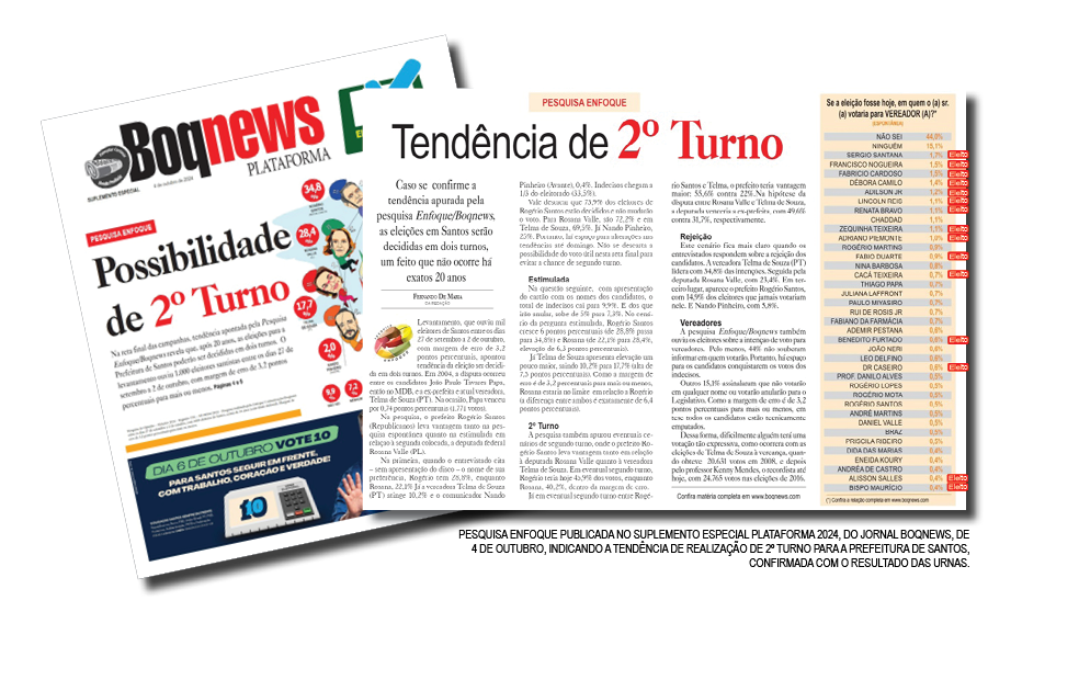 Mantendo a tradição de credibilidade, a pesquisa Enfoque/Boqnews antecipou novamente a tendência do eleitorado santista indicando os resultados das eleições municipais em Santos.
