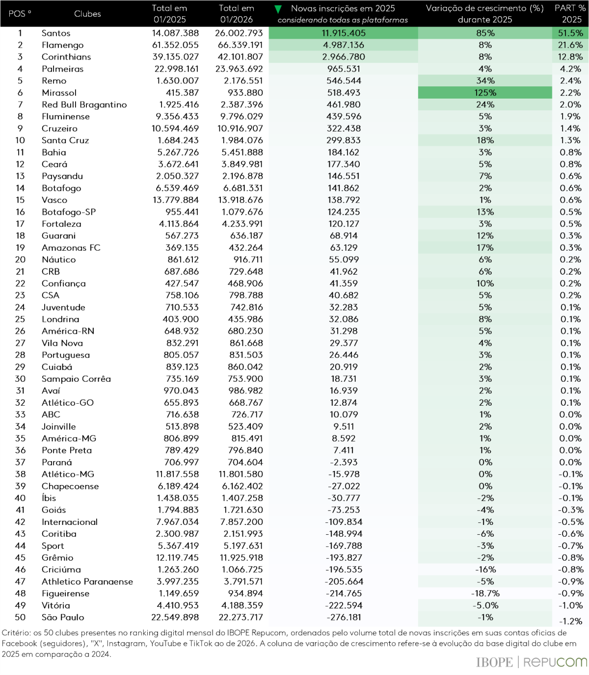 Assim, no acumulado de 2025, os cinco clubes que mais evoluíram em suas bases digitais foram: Santos (11,9 milhões de inscrições), Flamengo (4,9 milhões), Corinthians (2,9 milhões), Palmeiras (965 mil) e Remo (546 mil).
