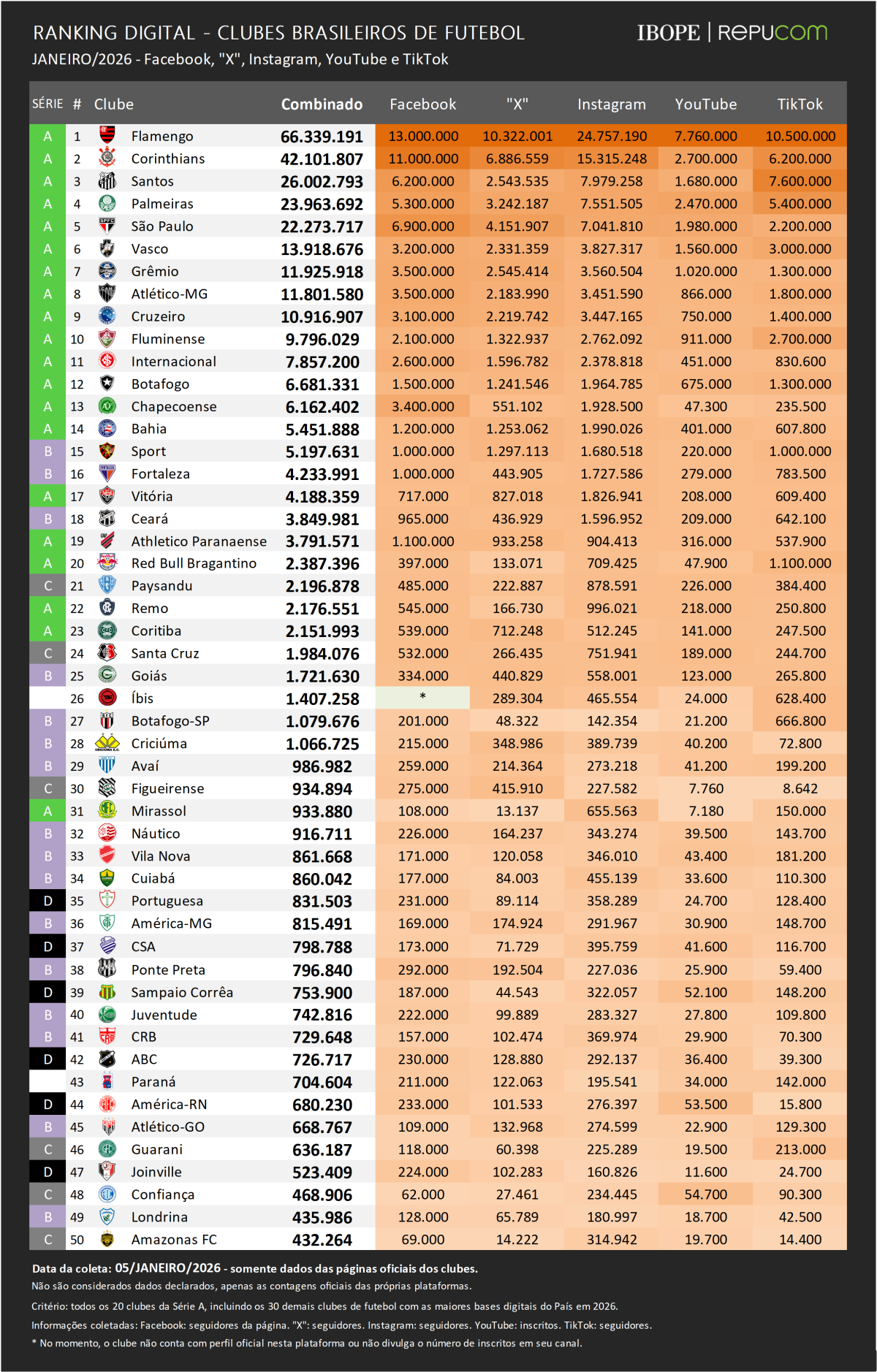 Na primeira edição do Ranking Digital dos Clubes Brasileiros de 2026, o IBOPE Repucom destaca o desempenho anual na busca por novos inscritos nas redes sociais dos 50 clubes monitorados durante o ano de 2025.