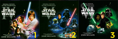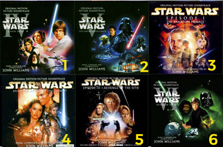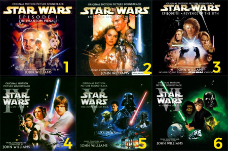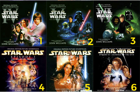 Assistindo pela ordem cronológica o efeito é completamente diferente de se assistir pela sequência de lançamentos. A trilogia I, II e III mostra os acontecimentos que precederam os episódios IV, V e VI. Nesse caso a sequência é a seguinte: Episódio I – A Ameaça Fantasma (1999), Episódio II – Ataque dos Clones (2002) e Episódio III – A Vingança dos Sith (1983), Episódio IV – Uma Nova Esperança (1977), Episódio V – O Império Contra-Ataca (1980), Episódio VI – O Retorno de Jedi (1983)