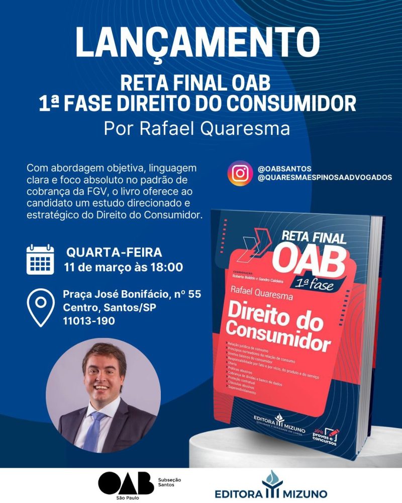 No próximo dia 11 de março, às 18h será lançado o livro Direito do Consumidor – Reta Final OAB – 1ª fase, do advogado Rafael Quaresma.