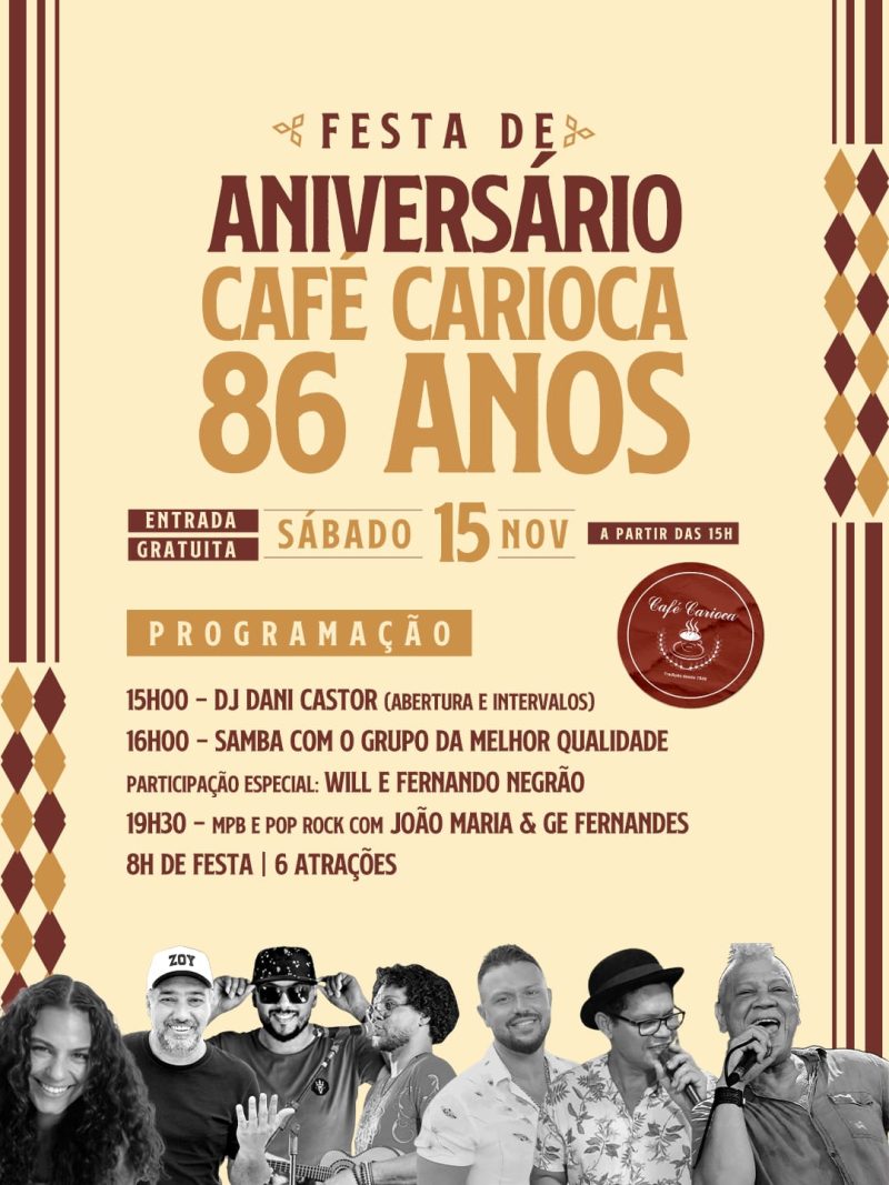 Vai ter festa e das boas! E não podia ser diferente. Símbolo da gastronomia de boteco e referência do cenário histórico, político e cultural da cidade de Santos, o Café Carioca celebra o seu 86º aniversário, no sábado (dia 15), a partir das 15h.