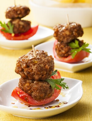 Lave os tomates, abra ao meio, retire as sementes e corte ao meio novamente. Sobre cada quarto de tomate, coloque duas almôndegas presas com um palito. Decore com uma folha de salsa e, na hora de servir, regue com um fio de azeite e polvilhe pimenta-do-reino.