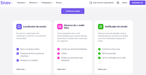 Snov.io | Busca de e-mails, verificação em tempo real, campanhas de outreach integradas | $29/mês | Times que buscam uma solução all-in-one |