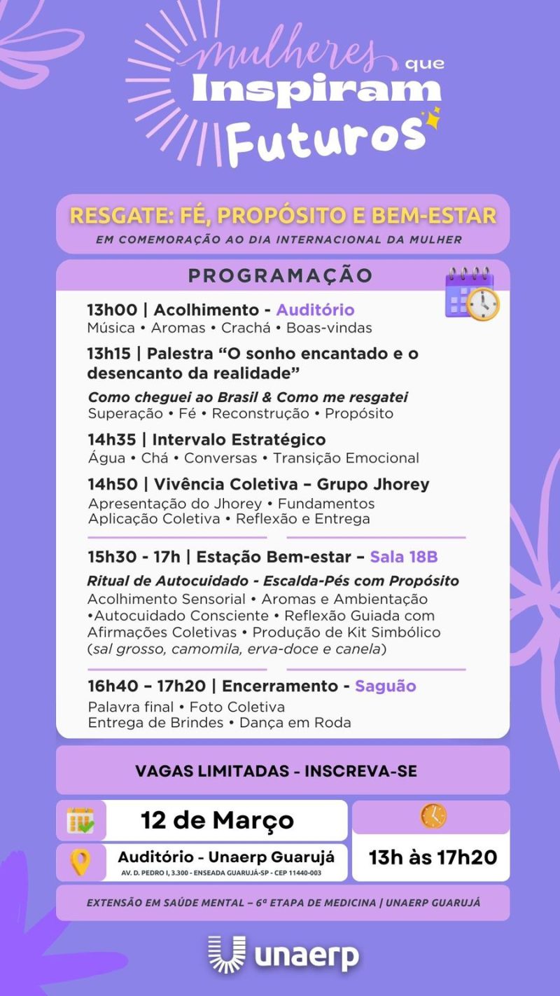 A Unaerp Guarujá realiza nesta quinta-feira (12), às 13h, o encontro “Resgate: Fé, Propósito e Bem-Estar”, voltado ao público feminino. A atividade celebra o Dia Internacional das Mulheres e reúne palestras e vivências sobre autoconhecimento e saúde emocional.