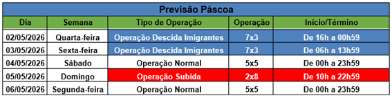 Para organizar a circulação e ampliar a capacidade das rodovias, poderão ser implantadas operações especiais, definidas em conjunto com a Agência de Transportes do Estado de São Paulo (Artesp) e com apoio da Polícia Rodoviária. As medidas têm como objetivo adequar a utilização das pistas ao volume de veículos, contribuindo para a fluidez e a segurança viária.