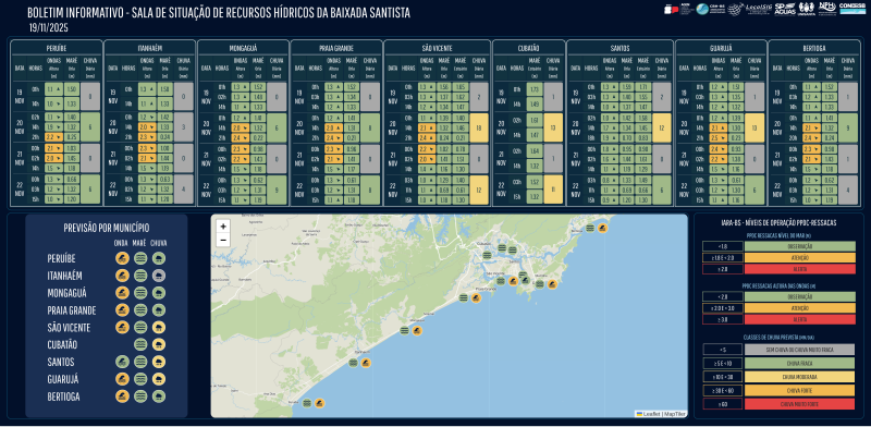 A informação é do Núcleo de Pesquisas Hidrodinâmicas da Unisanta e da Sala de Situação da Baixada Santista.
