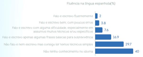Quando o assunto é a língua espanhola, o número de profissionais que possuem nível entre avançado e intermediário é ainda menor e abrange apenas 5,8% dos respondentes da pesquisa. Já o número de profissionais brasileiros que não possuem conhecimento algum do idioma chega a 40%.