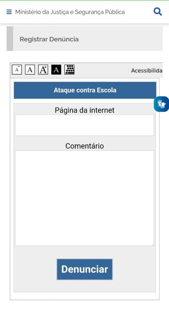 Para facilitar a análise da denúncia, recomenda-se o preenchimento do campo “Comentário” com as informações relevantes da ocorrência, tais como o Município, Estado, Escola da denúncia e Mídia Social de origem da ocorrência.