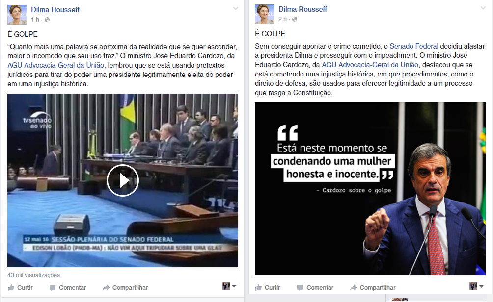 No post, que traz o vídeo do advogado-geral da União, José Eduardo Cardozo, em seu discurso de defesa da presidenta na sessão do Senado, Dilma destacou o trecho em que Cardozo alegou que “se está usando pretextos jurídicos para tirar do poder uma presidente legitimamente eleita do poder em uma injustiça histórica.”