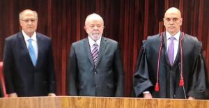 Lula ladeado pelo seu vice, Geraldo Alckmin (à esq.), e do presidente do TSE, Alexandre de Moraes. Foto: Reprodução