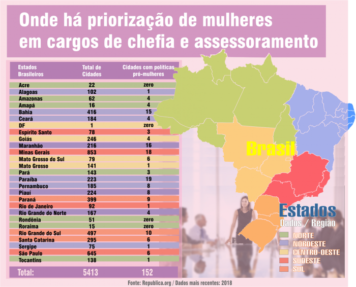 Aliás, o percentual de prefeituras administradas por mulheres supera em quatro vezes, por exemplo, o total de cidades onde há uma política pública que priorize a participação feminina em cargos de chefia e de assessoramento.