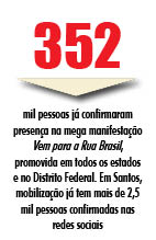 Em Santos, o manifesto está marcado para começar às 15 horas na Avenida Presidente Wilson, em frente ao Posto 2, no José Menino. De lá, os manifestantes sairão em passeata até a Praça Independência, no Gonzaga. A Mobilização Santista / Brasil, organizada por Luiz Fernando Lobão, já tem mais de 31 mil convidados na rede social Facebook, com mais de 2,5 mil pessoas confirmadas.