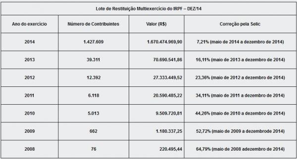 O crédito bancário para 1.491.181 contribuintes será feito no dia 15 de dezembro, totalizando o valor de R$ 1,8 bilhão, incluindo idosos e contribuintes com alguma deficiência física ou mental ou portador de moléstia grave. Os montantes de restituição para cada exercício e a respectiva taxa de juros (Selic) aplicada, podem ser conferidos na tabela a seguir.